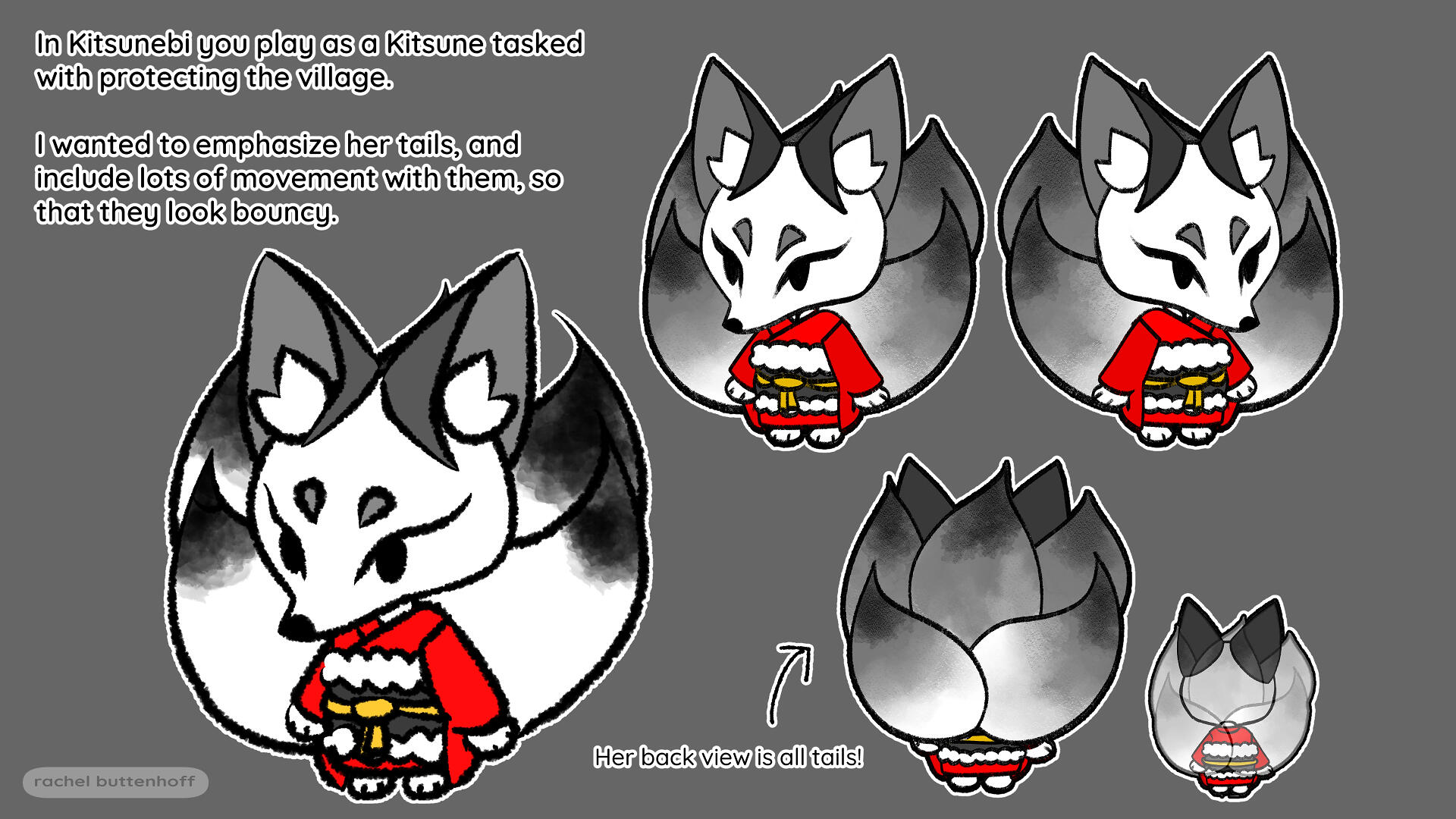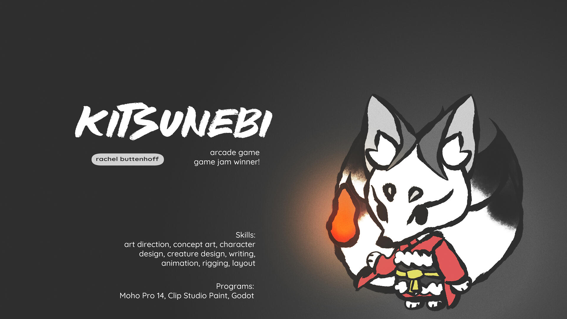 Kitsunebi is a concept I developed from early stages to a finished game in just 31 days, with the help of another person who handled most of the scripting, so I could focus on art design.The prompt was Halloween and Myths. We used the original Celtic story for Halloween--that people dressed as cryptids and monsters to ward off evil spirits. I wanted to use yokai and Japanese mythical creatures, as an appreciation and love letter to the way in which Japanese art depicts animals throughout history, and the vital role they play in their folklore.